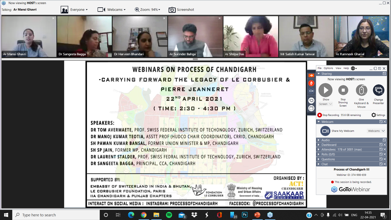 इस वेबिनार का आयोजन एक्ट! चंडीगढ़ और साकार फाउंडेशन द्वारा संयुक्त तौर पर किया गया था, जिसे भारत सरकार के आवास एवं शहरी मामले मंत्रालय, भारत और भूटान में आधिकारिक स्विस डिप्लोमैटिक प्रतिनिधि, ली कार्बूजि़यर फाउंडेशन, पेरिस, इंडियन इंस्टिट्यूट ऑफ आर्किटेक्ट्स, फायर एंड सिक्योरिटी एसोसिएशन ऑफ इंडिया और एसोचैम-जीईएम द्वारा समर्थित किया गया।