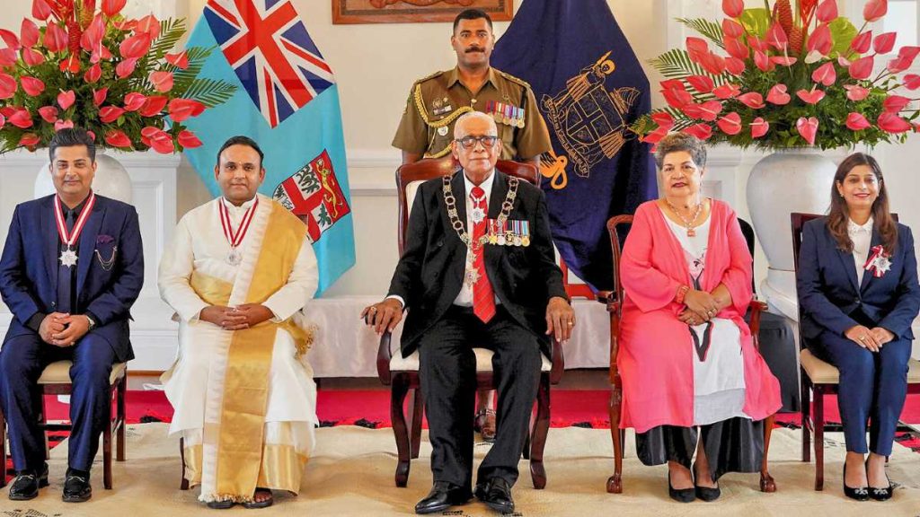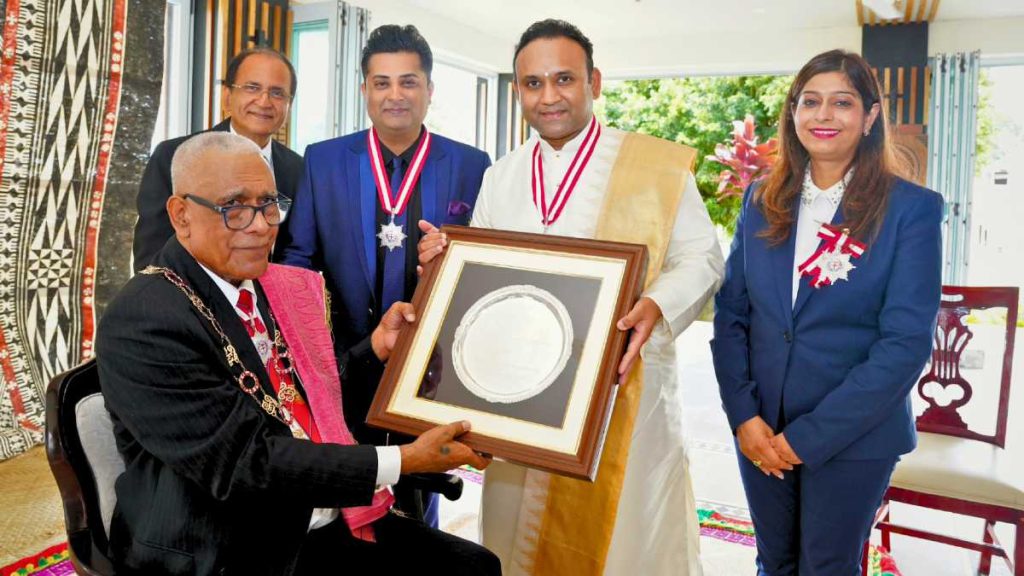 At a grand investiture ceremony held at the State House in Suva, the President of Fiji, His Excellency Ratu Naiqama Lalabalavu, presented this prestigious award to three individuals — Sumeet Tappoo, Dr Krupali Tappoo, and Sri Madhusudan Sai — describing them as “beacons of compassion and cultural pride for the people of Fiji”.