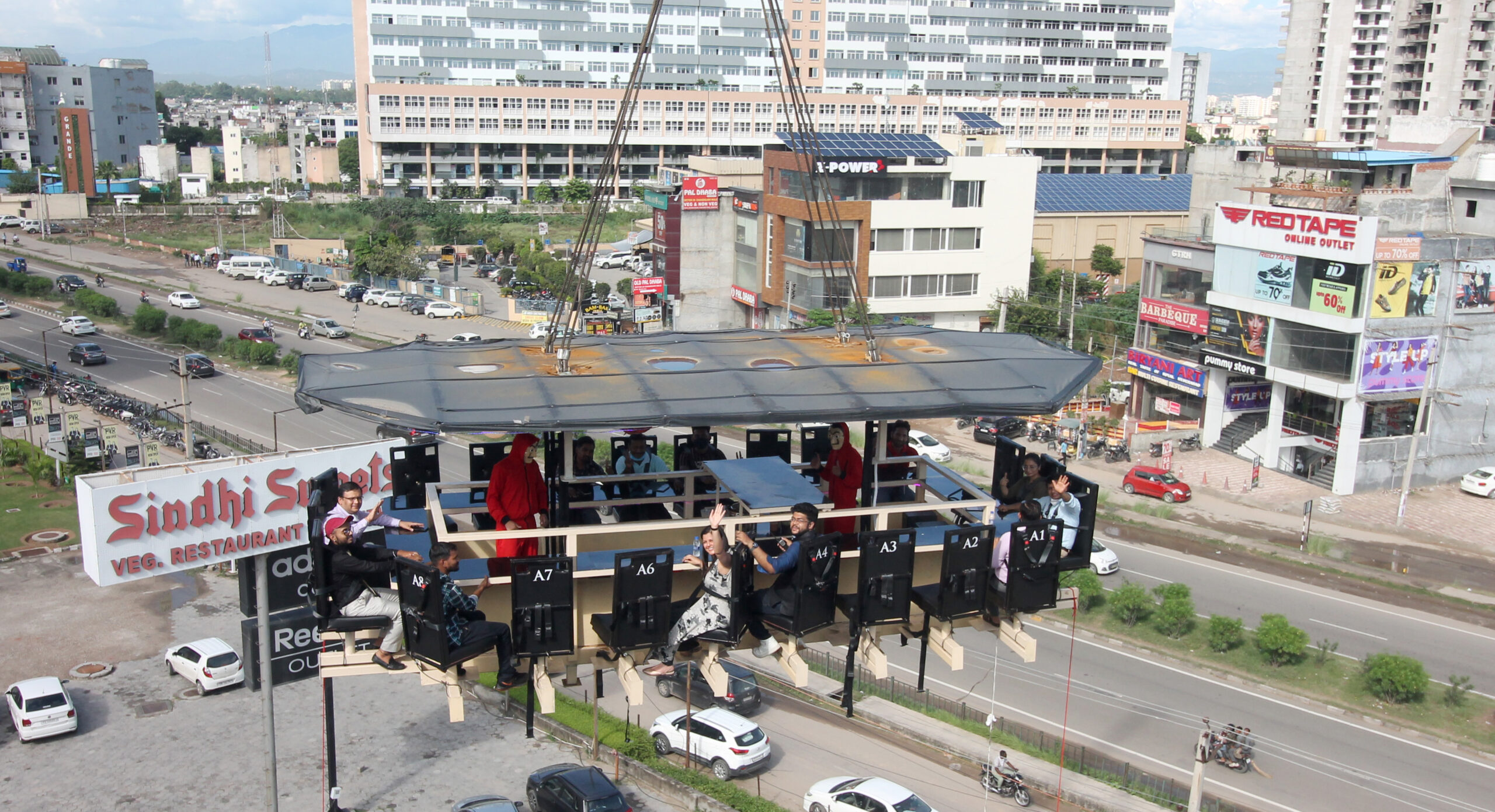 The first dining restaurant in the tricity on the lines of exotic Flying Dining has been opened which will double the joy of the dining for the diners amidst the melodious music at almost 100 feet above the ground. This concept has been introduced in the Upper North by Airfeast at Cosmo Mall in Zirakpur. In a one of its kind effort, a hydraulic crane lifts the table of 22 people to the Diners and Service Team from about 100 feet above the ground surface and provides an unforgettable moment of thrill. Ritvik Mittal, who introduced this flying dining concept in the tricity, said that it is certainly the first experience of its kind being provided to the Upper North. From a safety point of view, Mittal has clarified that after several trials, finally the green signal has been given for this flying dinning, in which the approval of all the government departments has been approved. He said that this dining experience package for just Rs 1500 offers a ‘three course meal’ with snacks, main course and desserts. The duration of the dining time will be up to 40 minutes which involves 360 rotations. Ramanpreet Singh, Head, Cosmo Mall, who was also present on the occasion said that Cosmo Mall has always endeavored to provide new experiences to its consumers by forming high quality alliances.