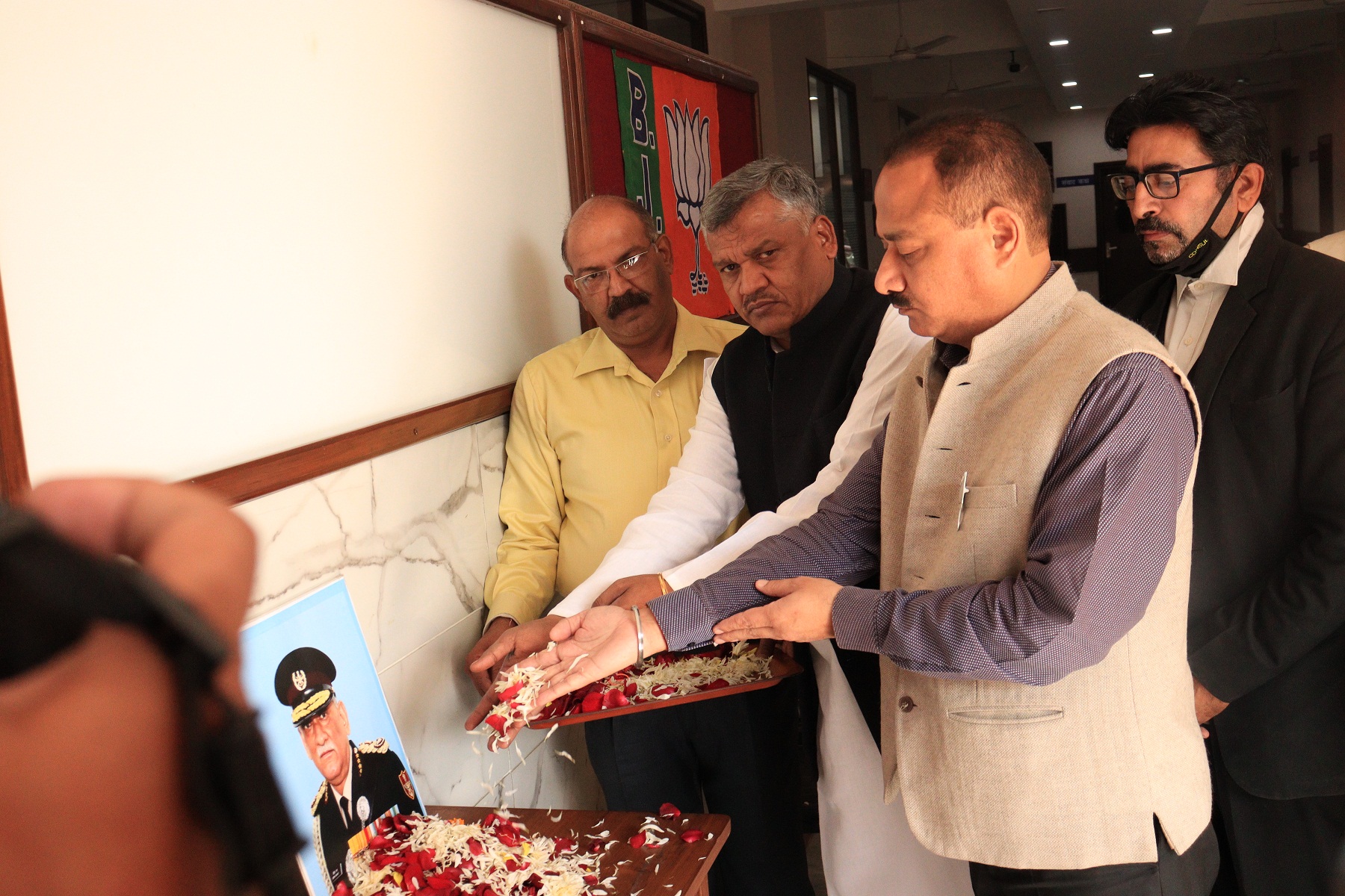 Mayor Ravikant Sharma, BJP General Secretary Rambir Bhatti and Chandrashekhar, BJP spokesperson Kailash Jain and many leaders paid tribute to Gen Bipin Rawat in the tribute ceremony organized at the BJP Party Office at Sector 33. Meanwhile, party candidate Heera Negi from Ward No. 22, Jasmanpreet Singh from Ward No. 32, Sachin Lotia from Ward No. 24, Ravinder Rawat from Ward No. 27, Devesh Modgil from Ward No. 2, Anoop Gupta from Ward No. 11 and from Ward No. 30. Shakti devshali, paying tribute to General Bipin Rawat in his respective offices, observed two minutes silence and prayed for his spiritual peace.
