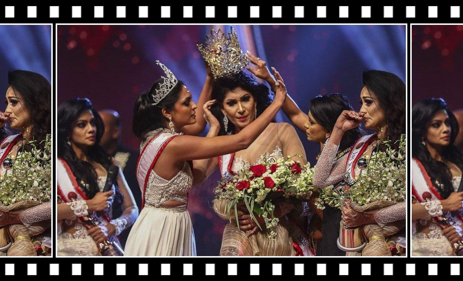 Pushpika De Silva wearing Crown, Caroline Jury making statement on stage, & forcibly ripping the Crown off De Silva’s head.